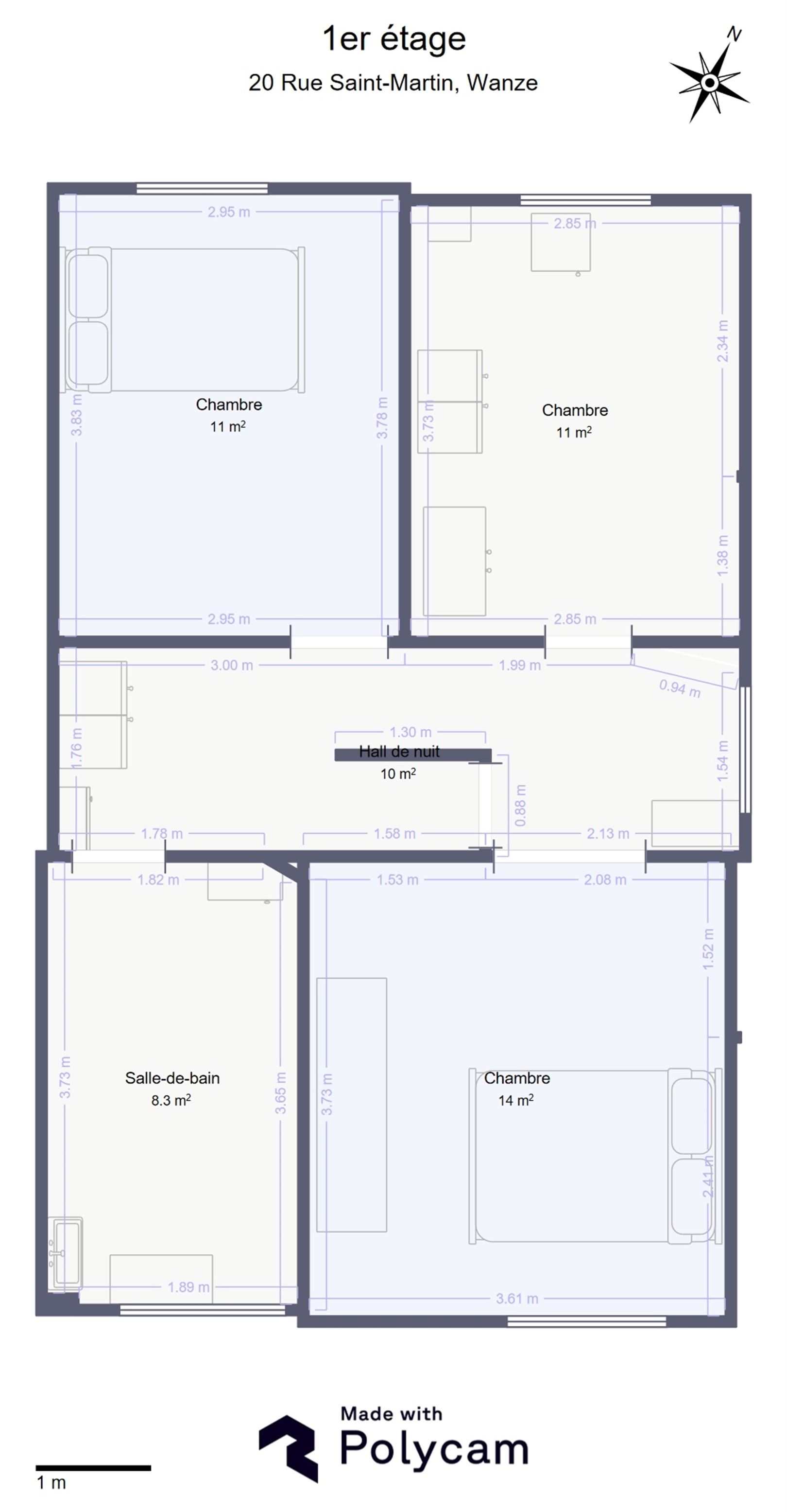 Hall de nuit desservant trois belles chambres (14 m², 11 m² et 11 m²) et une salle de bain.