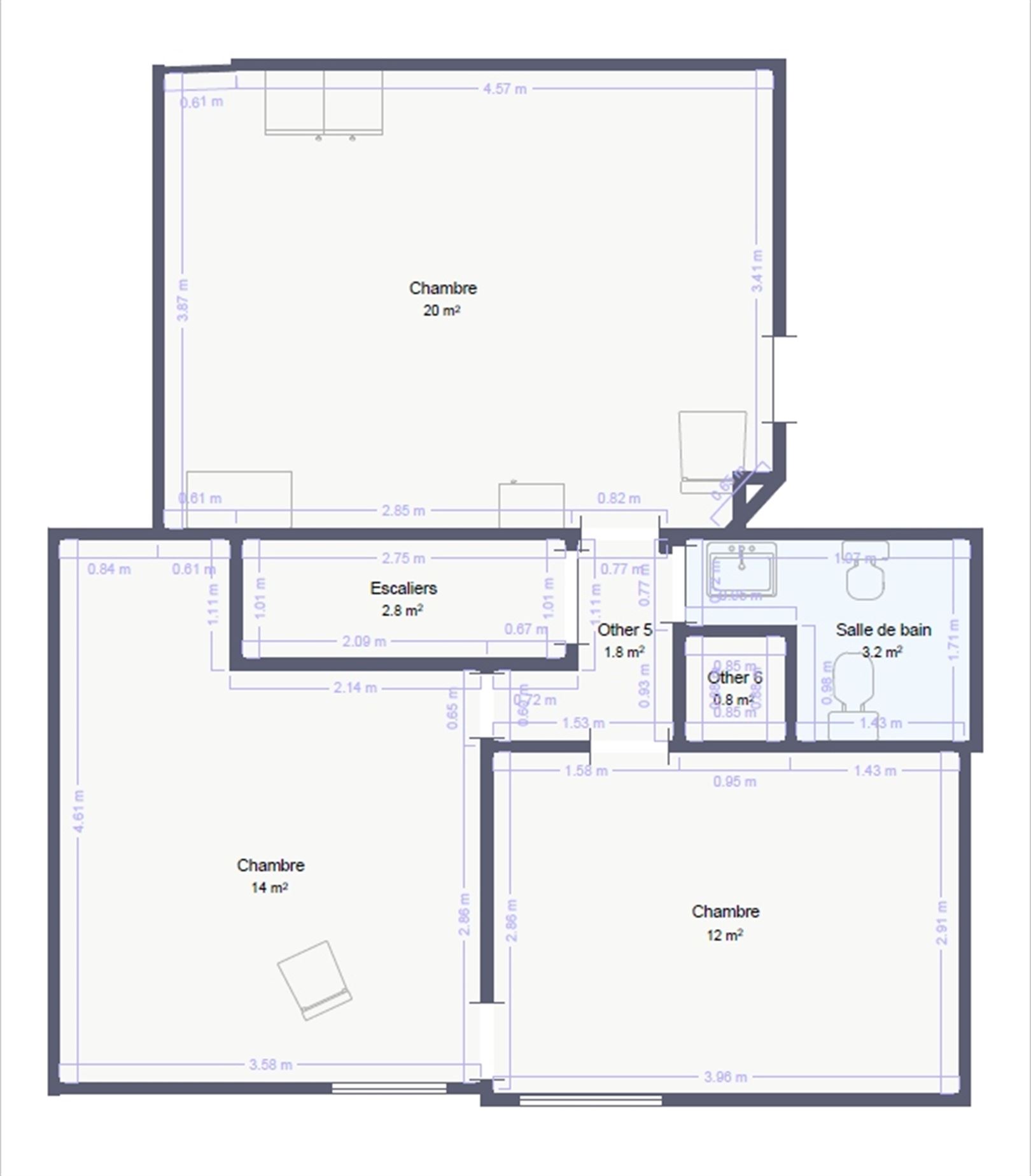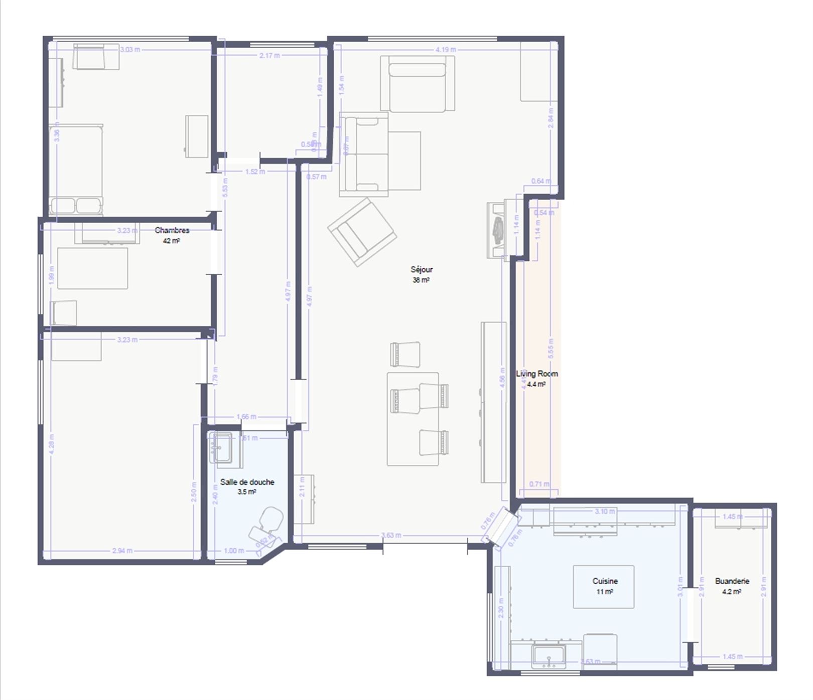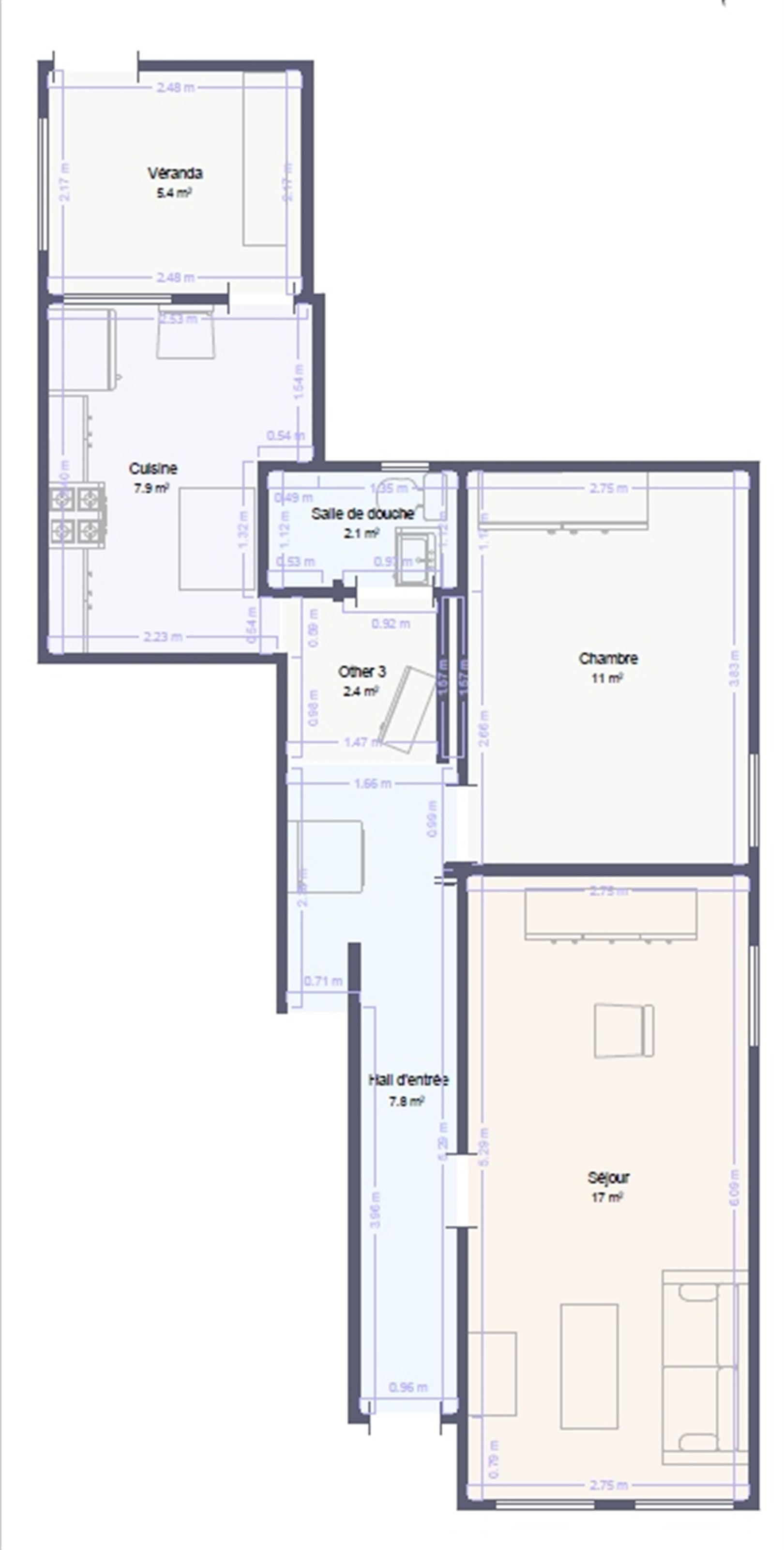 Composition appartement : Hall d’entrée, salon, salle à manger, cuisine et arrière-cuisine, une chambre et une salle de bain.